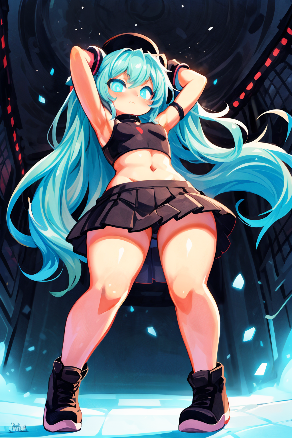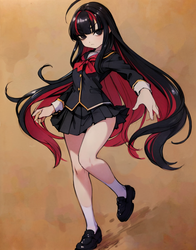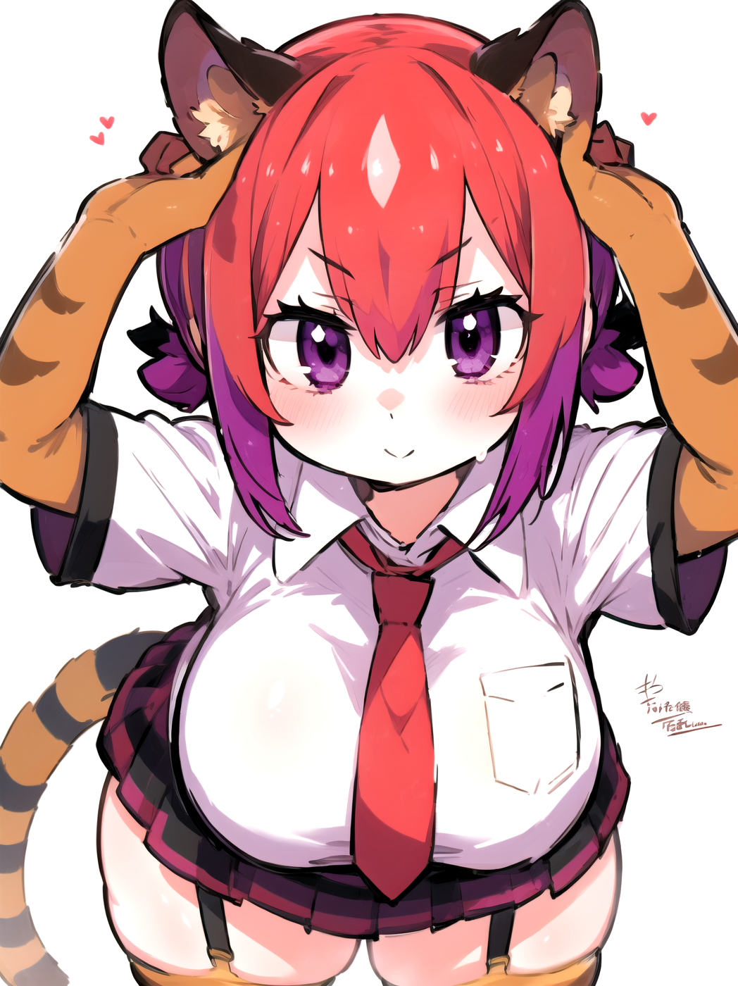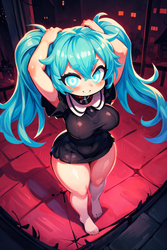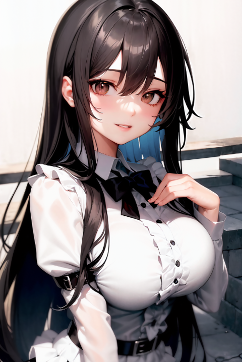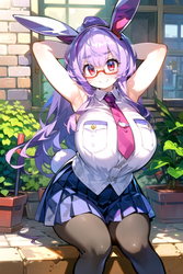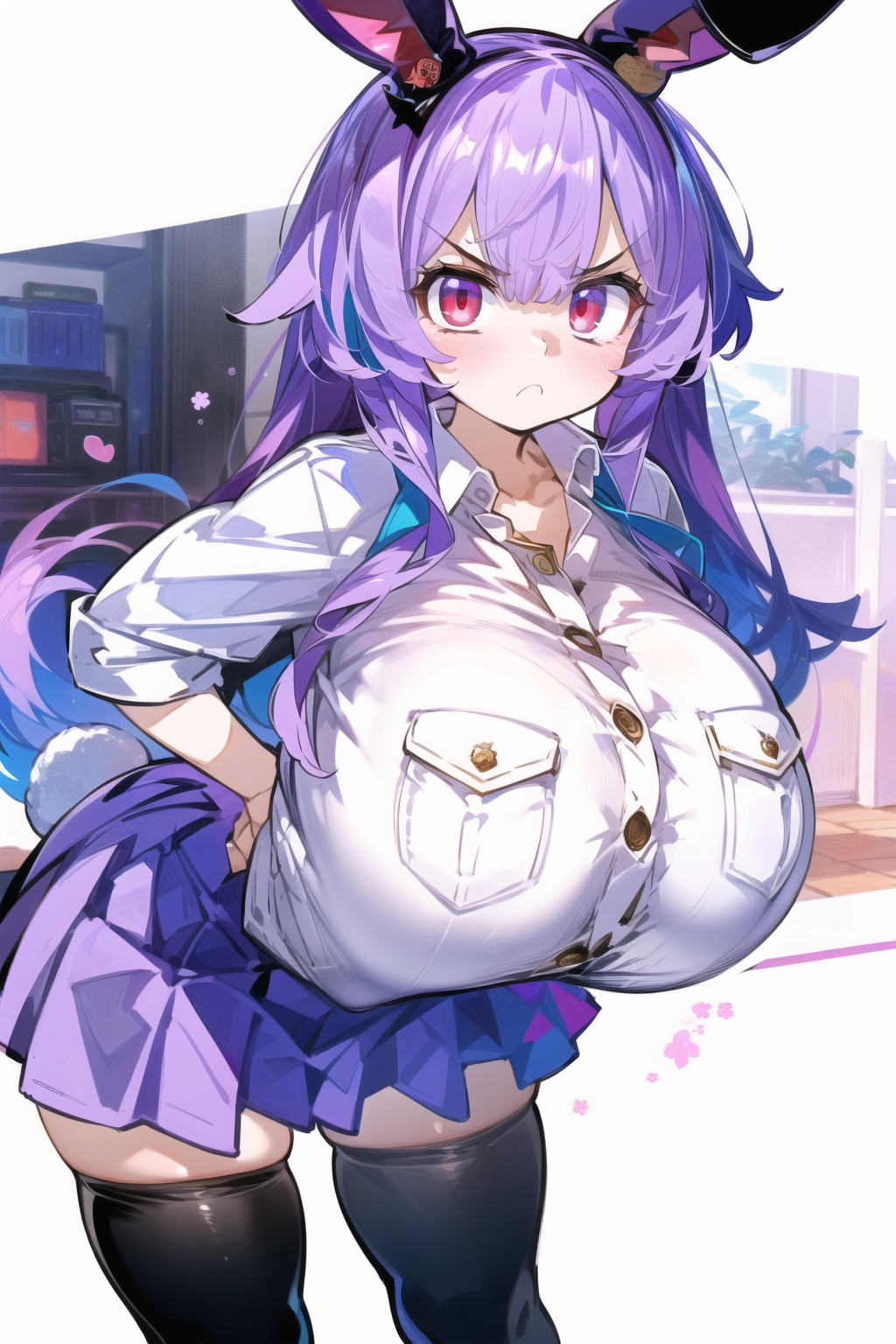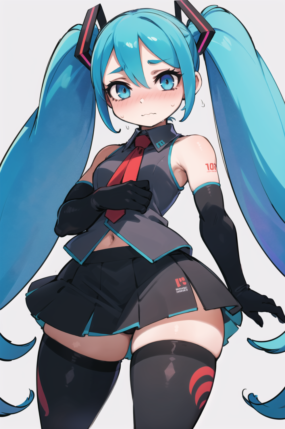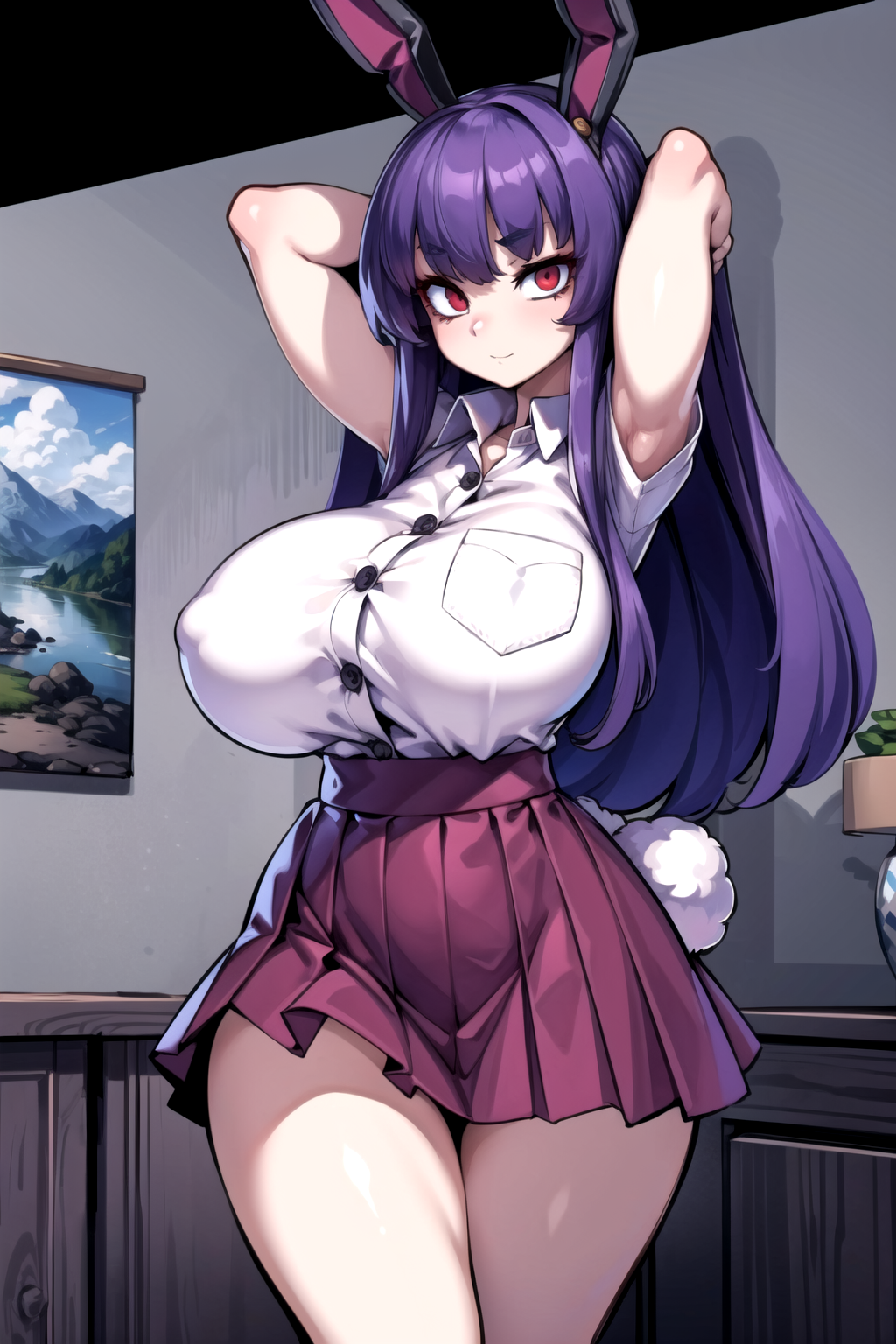 Negative prompt: verybadimagenegative_v1.3, (badhandv4), EasyNegativeV2, extra fingers, missing fingers, naval, exposed nipples, (nsfw), fat belly, midriff, ((purple eyes, blue eyes, red skirt, brown skirt)), headphones, muffin top, nails, hair ribbon, (shirt tucked in:1.3), bridal gauntlets, black wristband, black legwear, black thighhighs, large breasts, gloves, leotard,