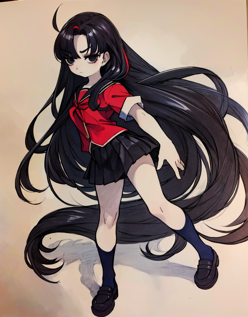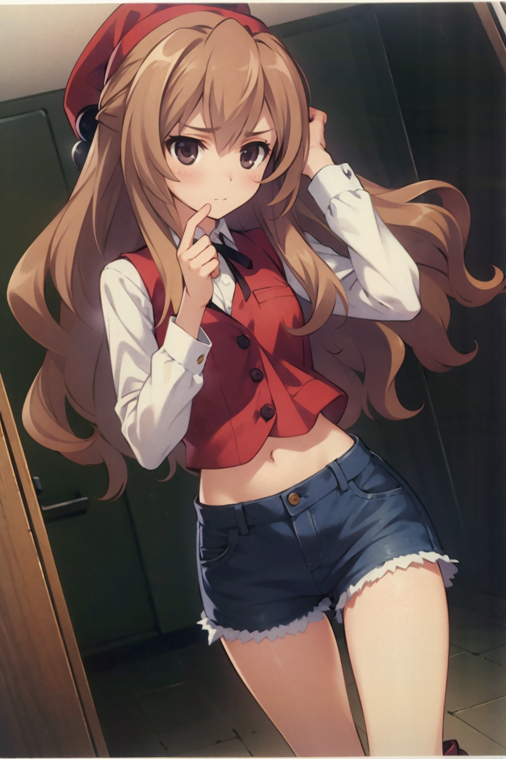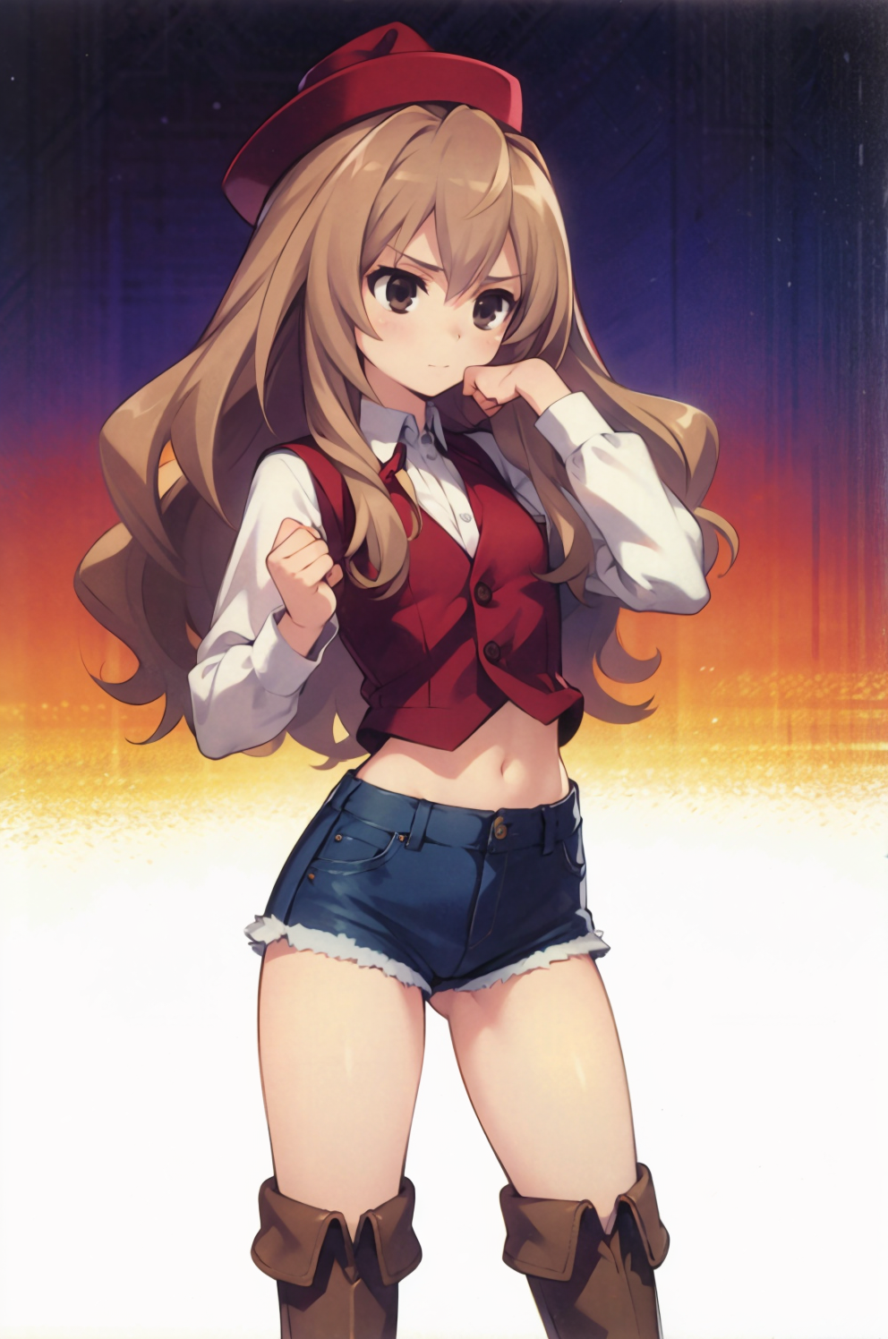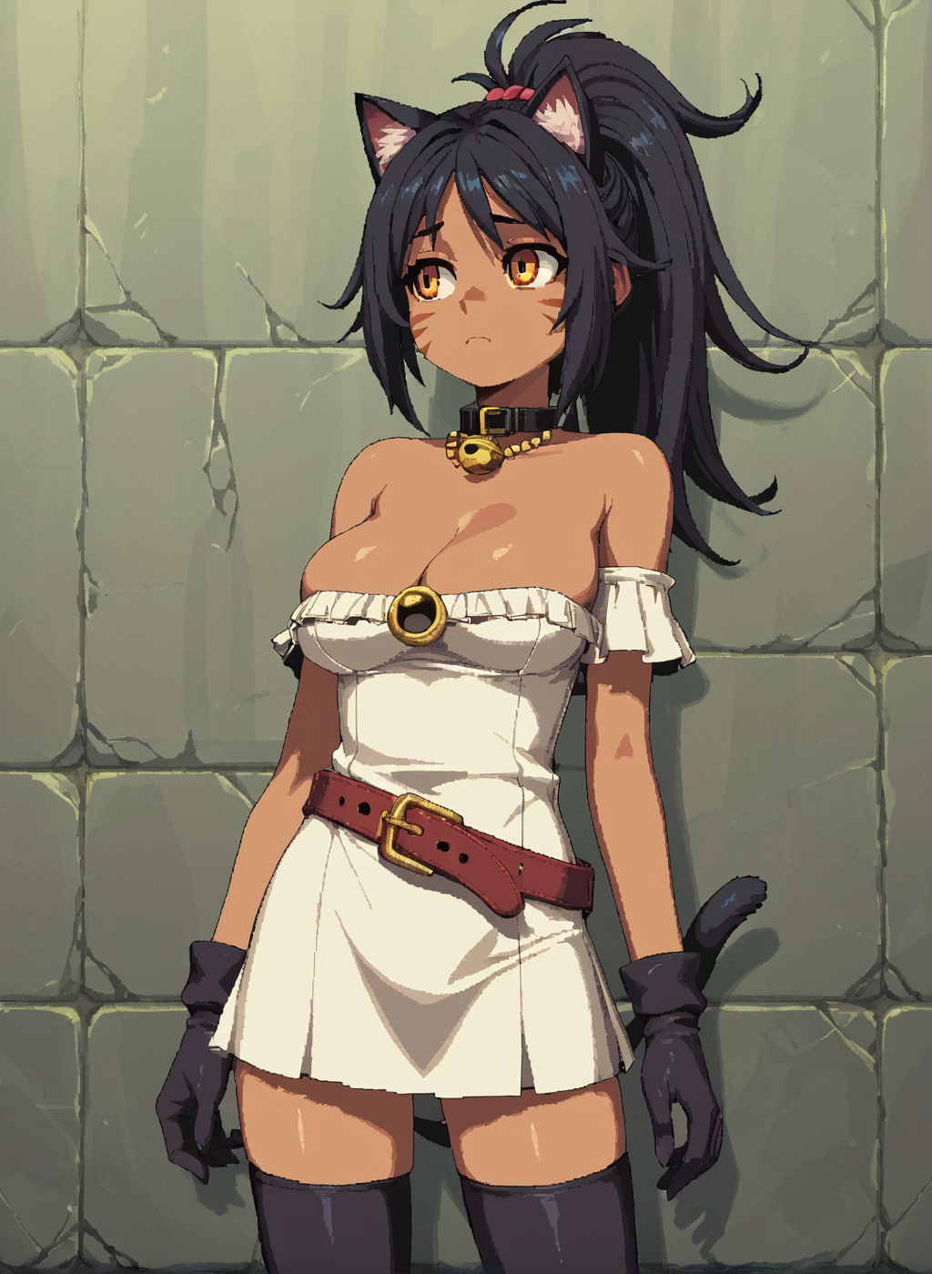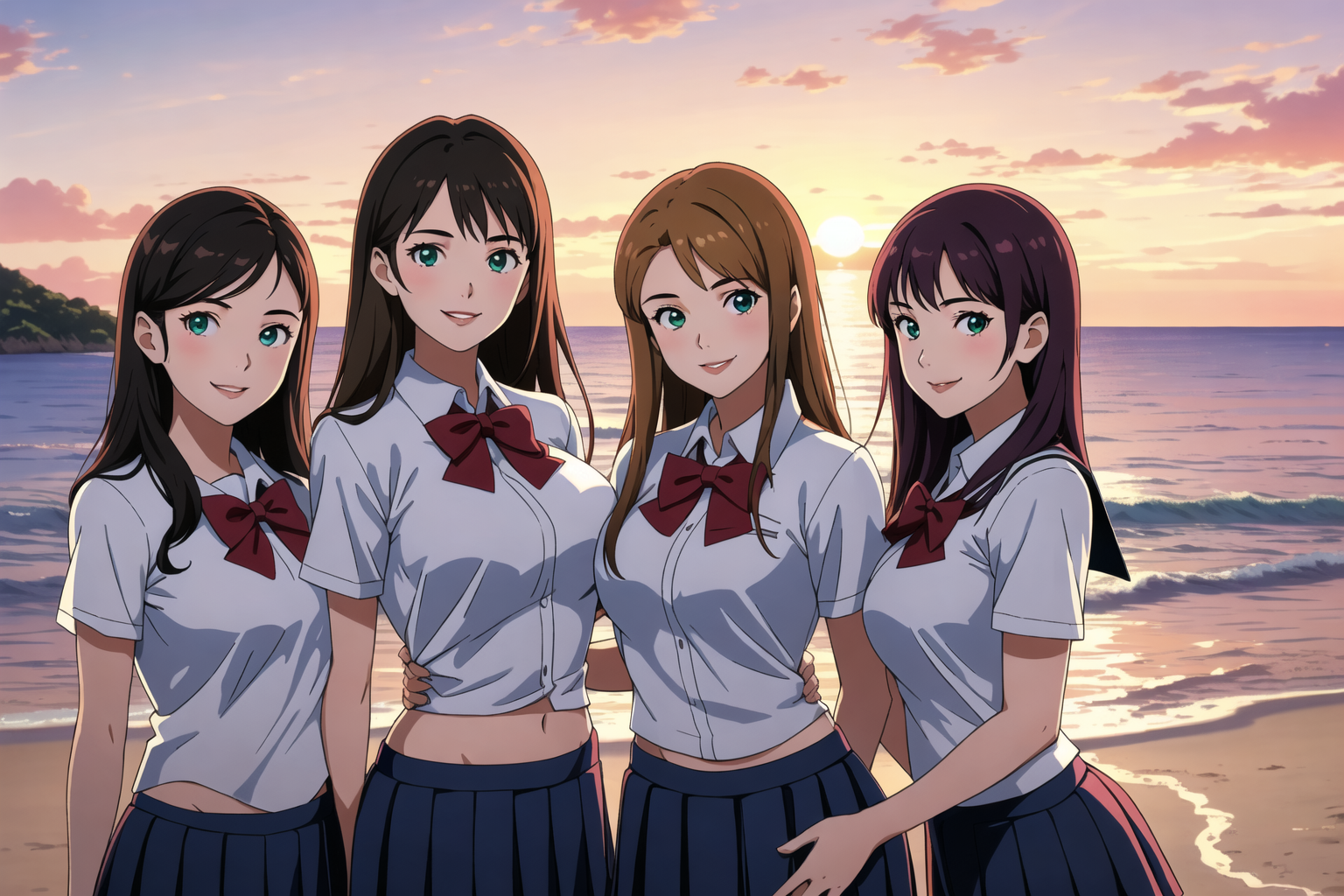 Negative prompt: verybadimagenegative_v1.3, (badhandv4), EasyNegativeV2, extra fingers, missing fingers, naval, exposed nipples, (nsfw), fat belly, midriff, ((purple eyes, blue eyes, red skirt, brown skirt)), headphones, muffin top, nails, hair ribbon, (shirt tucked in:1.3), bridal gauntlets, black wristband, black legwear, black thighhighs, large breasts, gloves, leotard,