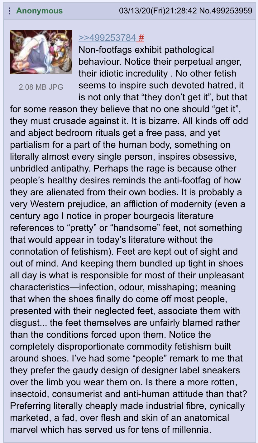 I'll let you in on a trade secret. I've no idea what you're really trying to do, since you're not a full footfag or you'd know this already, I just felt like responding. If you're trying to understand and get a new fetish, these anons can absolutely get you into it, don't ask without being sure. Listen, here's the thing that all of us know: It's absolutely impossible for an artist to draw really good feet without being a footfag. I doubt it happens with ANY other body part. There's an incredible amount of effort you have to put in, at least as difficult as hands, for very little reward unless you have the specific fetish yourself