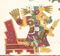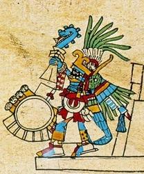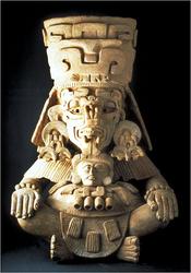 >A funerary urn in the form of a deity effigy (Monte Alban, Zapotec civilization; this urn is currently on display at the Gardiner Textile Musuem in Canada)