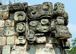 >A sculpture of a Witz monster/god building decoration (Temple 22, Copan)
