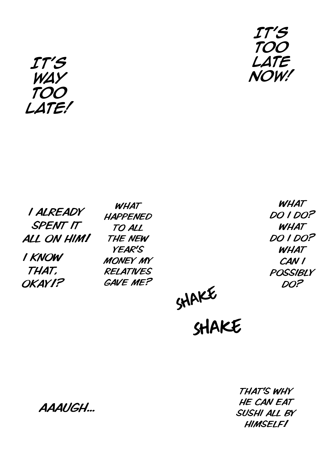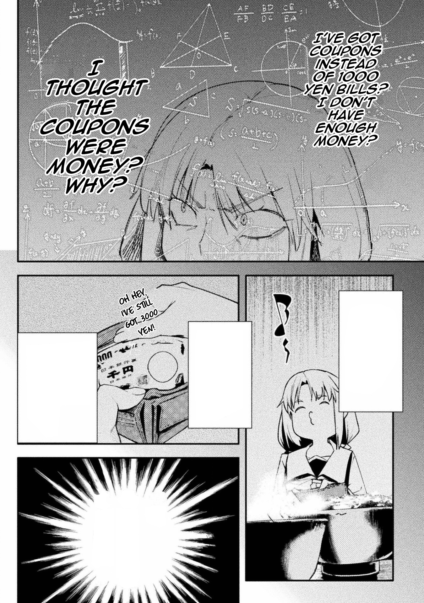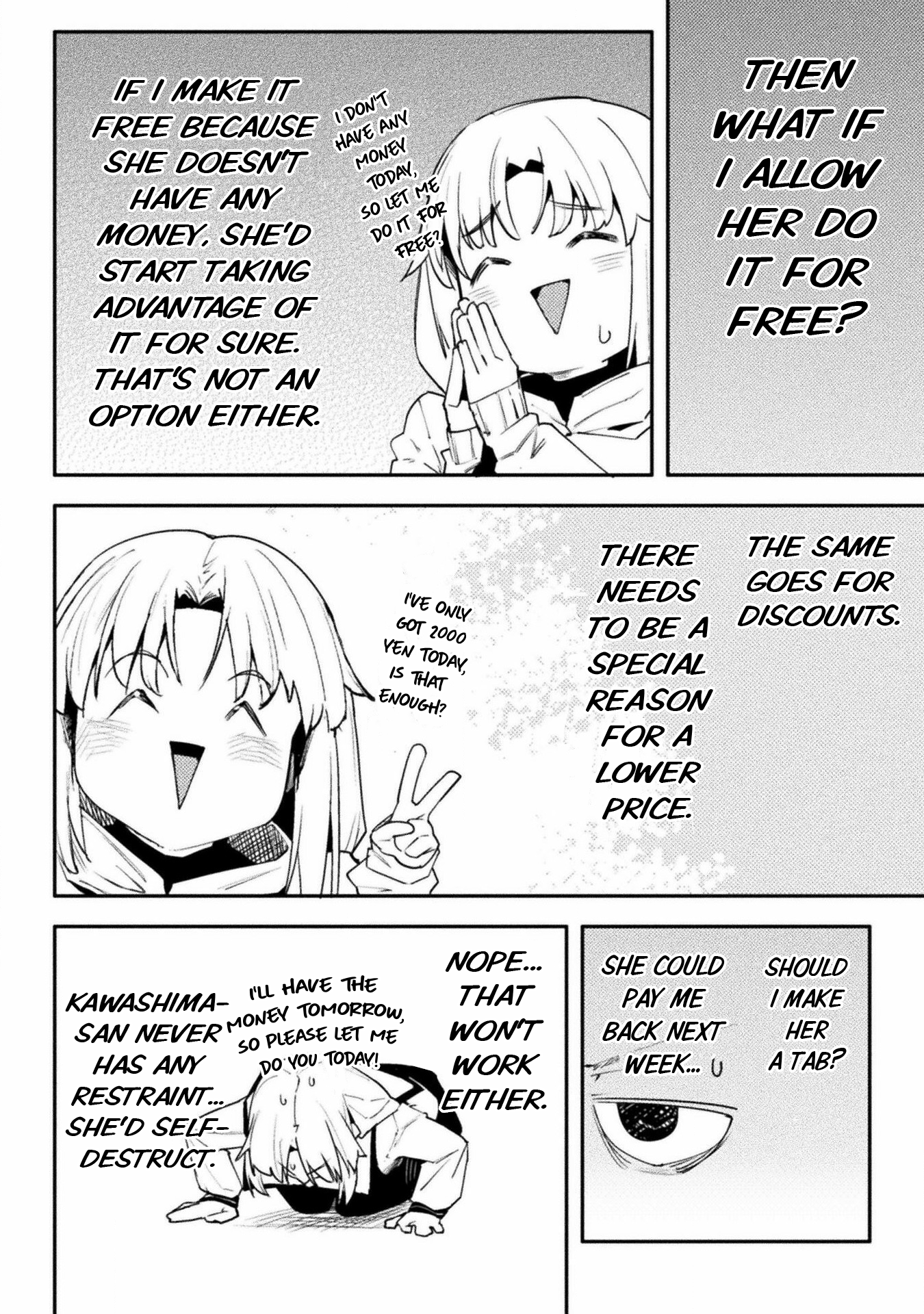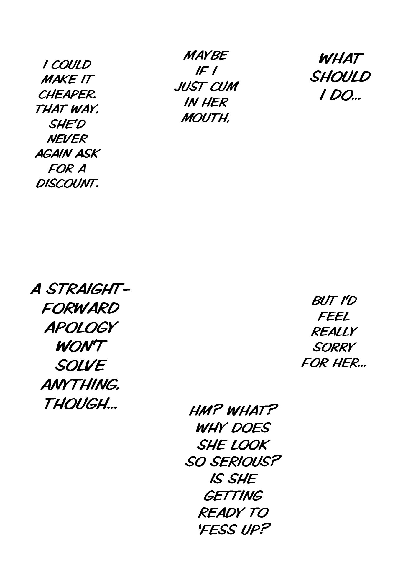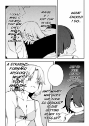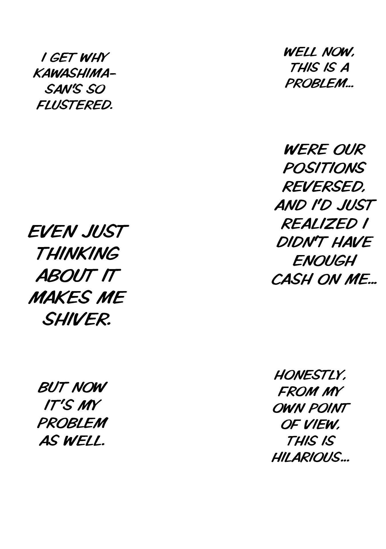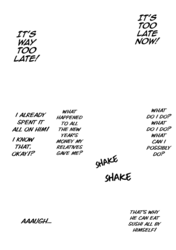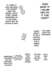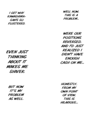 Again, I'll work with you later on getting some of that looking better. For now though, give fully redrawing the fingers in the third panel of 004 a try, as they just sort of vanish as it is now, and fix up someone of the areas where the stroke of the raw text is still present (such as around Kawashima's sock on 0011). Also, see if you can figure out anything as to why your edited pages are coming out darker than the raw pages up there are? Try opening both versions of 0003 I've included here in your browser as tabs, and then toggle back and forth between them. You should be able to see a difference in the shades in doing so, especially with the last panel. It's important the shades come out right, both for preservation of art detail and so I can mask various things back in if need be.