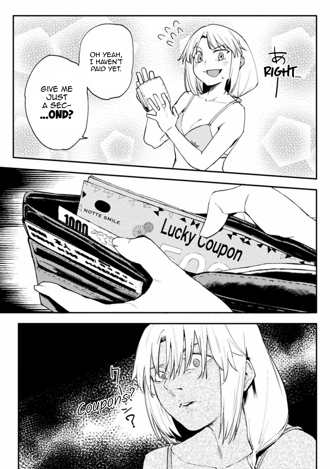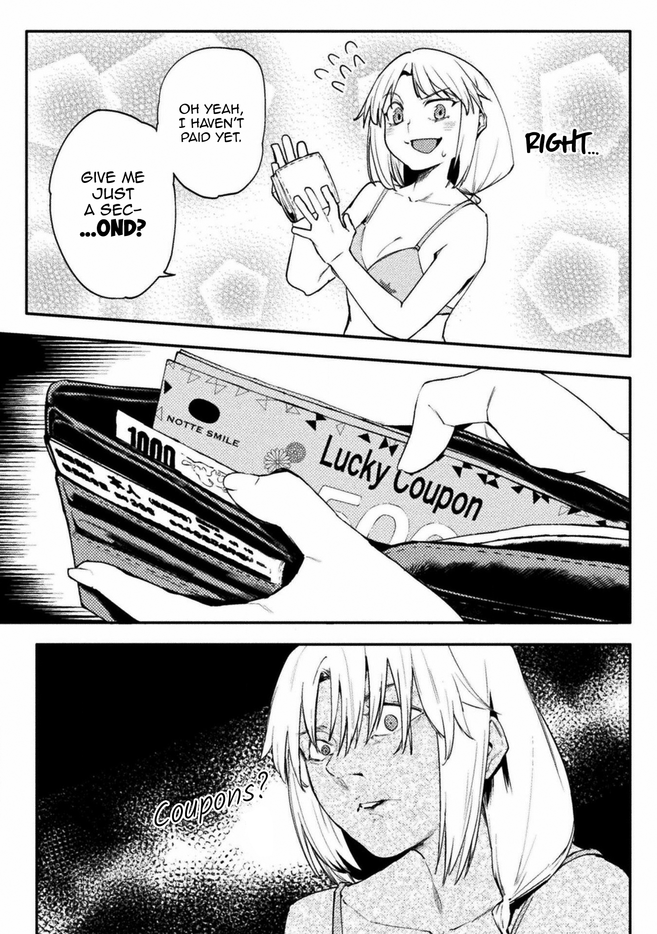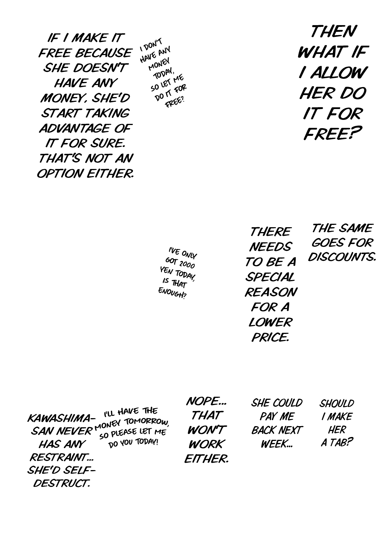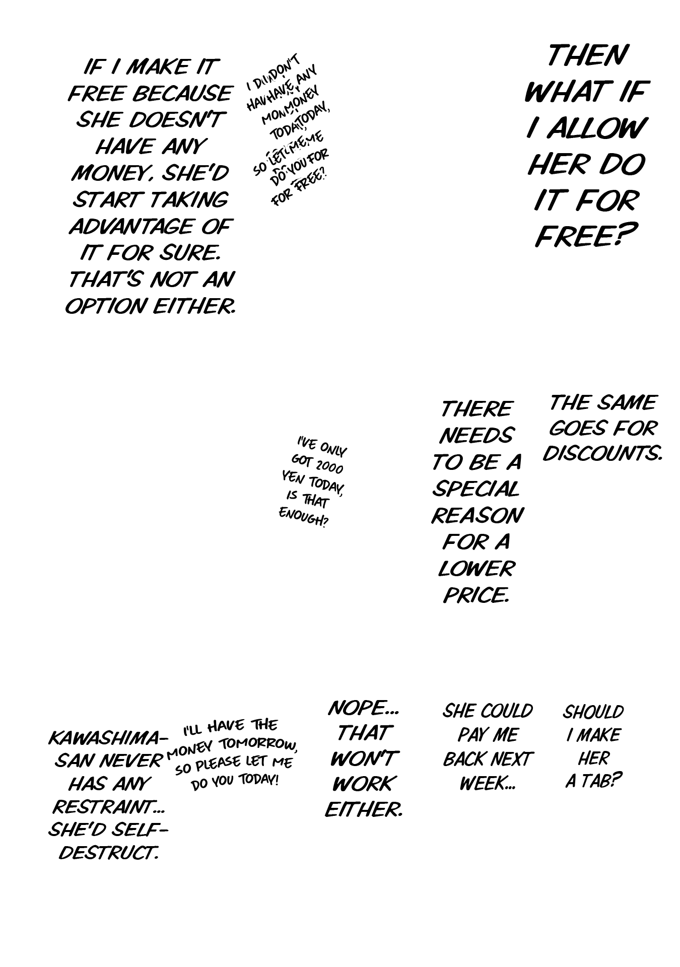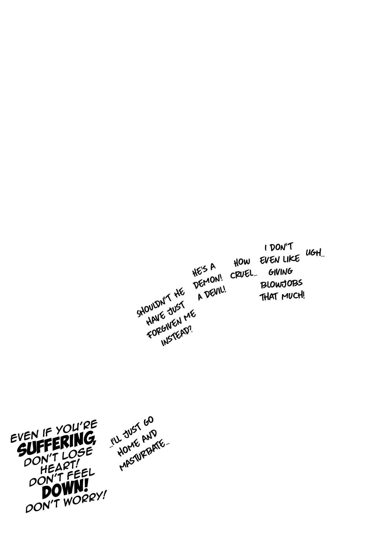 Again, I'll work with you later on getting some of that looking better. For now though, give fully redrawing the fingers in the third panel of 004 a try, as they just sort of vanish as it is now, and fix up someone of the areas where the stroke of the raw text is still present (such as around Kawashima's sock on 0011). Also, see if you can figure out anything as to why your edited pages are coming out darker than the raw pages up there are? Try opening both versions of 0003 I've included here in your browser as tabs, and then toggle back and forth between them. You should be able to see a difference in the shades in doing so, especially with the last panel. It's important the shades come out right, both for preservation of art detail and so I can mask various things back in if need be.