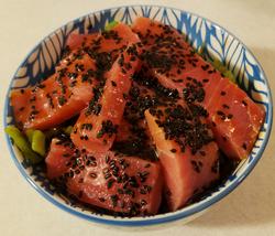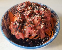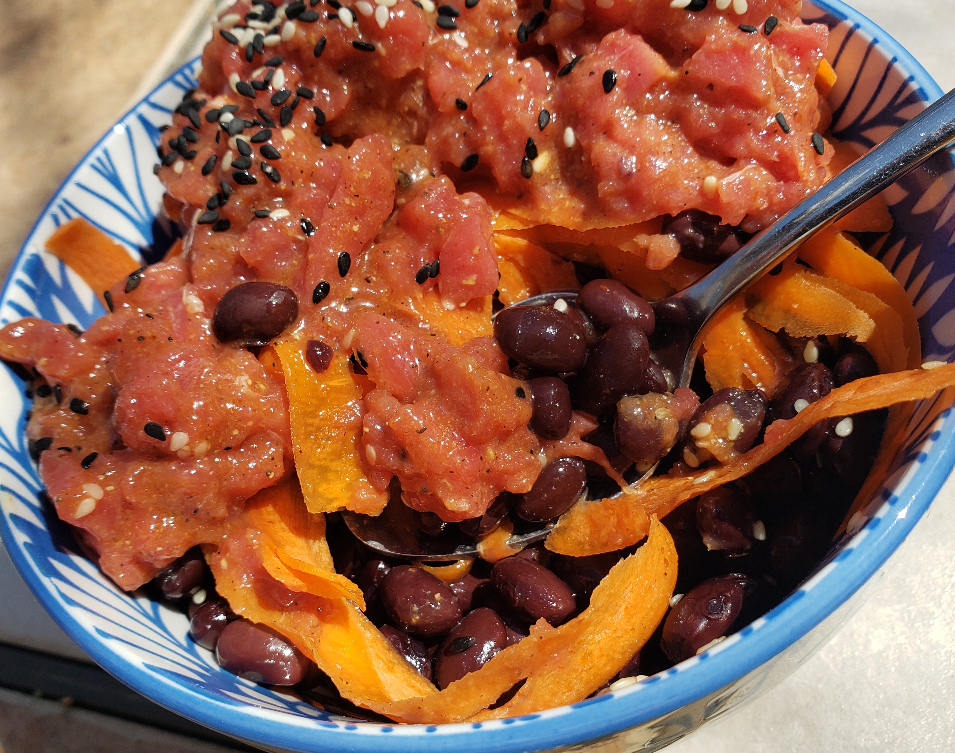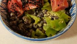 These are just lazy and quick breakfast meals. Both were bretty nice.  The first is slices of raw tuna dressed with sesame seeds, sesame oil, and Tabasco sauce served on top of roasted anaheim chilis and canned black beans flavored with Chic-fil-A sauce. The second is a tuna tartar of sorts. The chopped tuna was mixed with ketchup, brown mustard, soy sauce, cider vinegar, and black pepper. Underneath the fish are shaved carrot and black beans flavored with a bit of sesame oil. Sesame seeds were added on top.