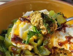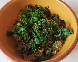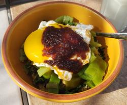 I first roasted some anaheim chilis and a bit of kale. The base was made from 1/2 cup rolled oats, 2 tbs chia seeds. 2 tbs hemp hearts, 2 tbs pumpkin seed powder, 1 tsp curry powder, and 1 1/4 cups water. The veggies were added on top with a fried egg and reduced sauce made of equal parts ketchup, worcestershire, and butter.