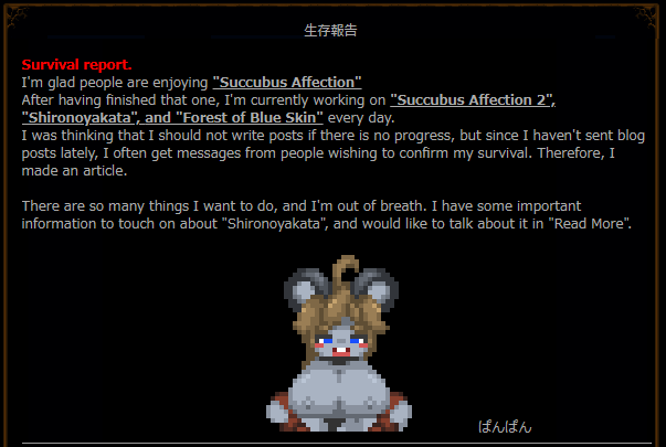 It helps to have a translation browser extension to translate specific highlighted text. I usually post images of the blogposts translated if it is something worth mentioning. At least I would if Zell stopped showing off Succubus Affection and the new HGame horror title he's working on.