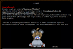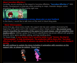 Nothing necessarily new, mostly just a post confirming that Succubus Affection 2's development is underway, the horror H game Shironoyakata (I think that translates as The White Mansion?) is also getting updates on Fantia and monthly demos (behind a paywall). And finally, fobs probably won't see an update until three areas are completely done.