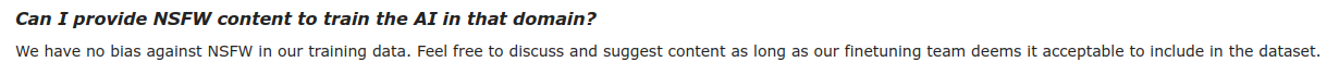 Nah, they meant that to say that they won't put low effort fanfic trash to poison the AI's quality like the retards at Latitude did, as long as what was provided was of high quality, they would try to get it for finetuning. Try using AN for that, raping my teenage daughter was like one of the first things I did to test for censorship and I had good results.