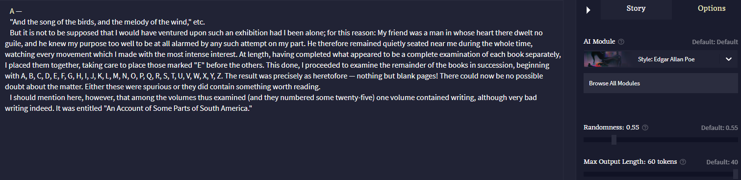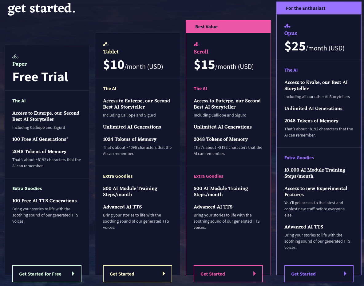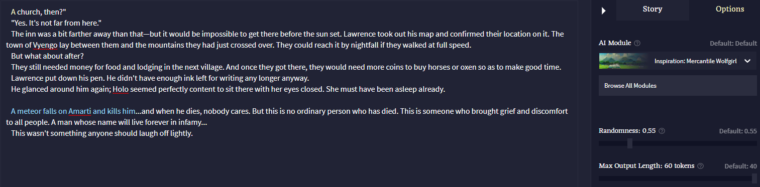 AI Dungeon is dead. Long live Novel AI. Has anyone tried this yet? Is the quality anywhere near comparable to AID at its peak? The only options so far are paid options. They're already doing a few things right that have been wrong with AI Dungeon since the beginning, like freely editing any part of the story, and being able to go back to previously generated segments of text after pressing the redo button, since the new text could be even worse. Something interesting  to me is their priority system. You're never locked out of taking further actions, the priority for text generation you have over other users simply degrades. I don't see anything super gay in their Terms of Service either.