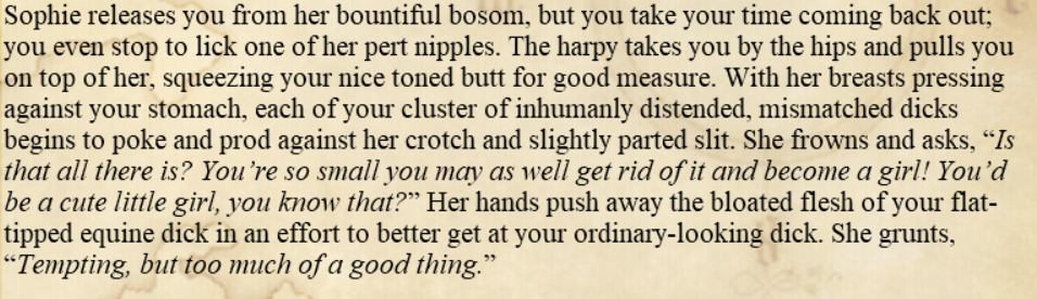 fuck, sorry for so many posts. there was also a bad ending sequence of a female PC getting impregnanted by an imp who becomes a demonlord through your Lethicite.