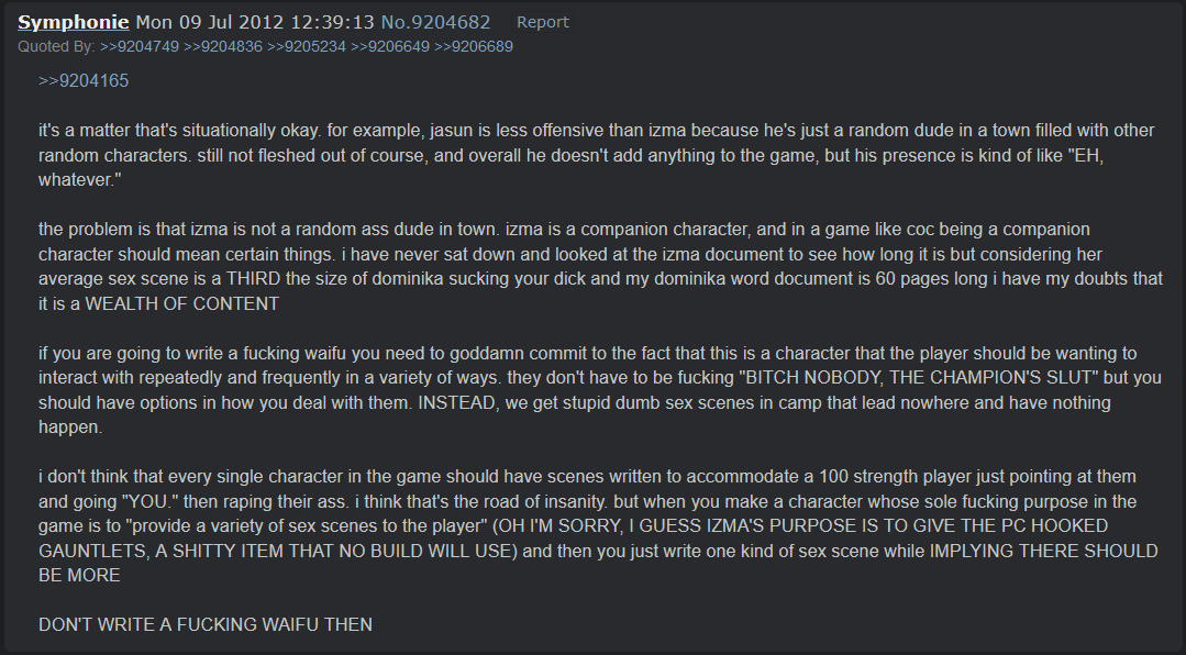 Fen was shocked that cuckchan largely didn't care about the scene and that all of the (extremely) negative responses he was receiving for putting the scene in were from his more loyal Fenoxo.com fanbase. It him consider finding a job for the first time since making a career out of CoC in April 2012: