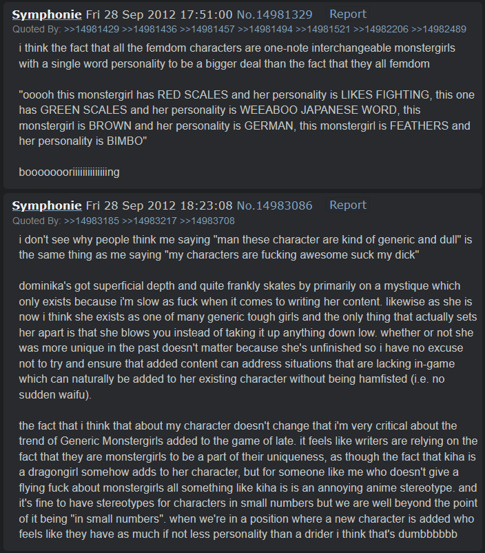 She was also written as outright anti-futa until community pressure forced her author to add in options for female/herm characters. Then a few months later Amily's author was turned into a herm fanatic by Urta and eventually ended up writing shit for Amily like that Urta x Amily NTR scene as well as planning herm expansions for various NPCs that didn't have dicks, like Edryn.