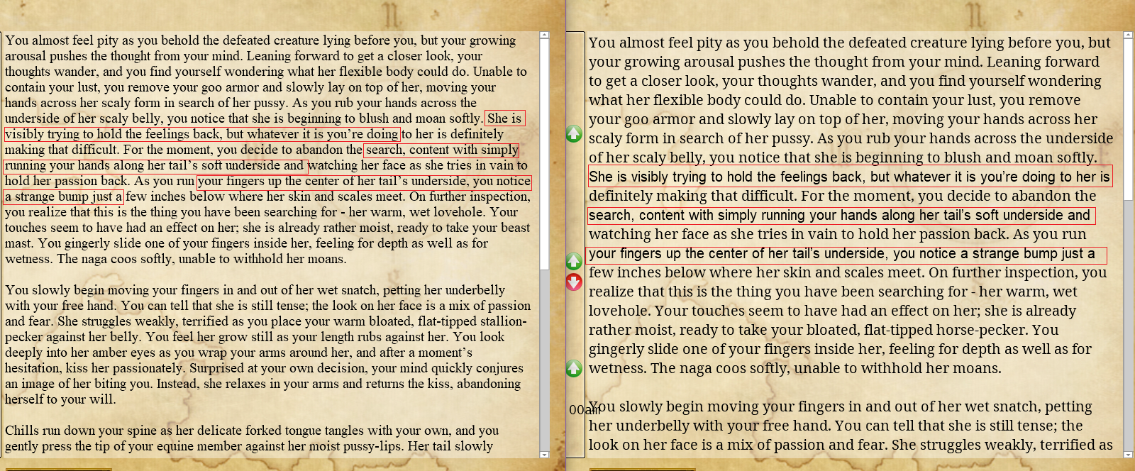 We tend to grow up fast and," she [if (dedicked izma) {shuffles her thighs and looks to her lap|directs her gaze to the half-erect bulge in her skirt}], "have a high libido [...]