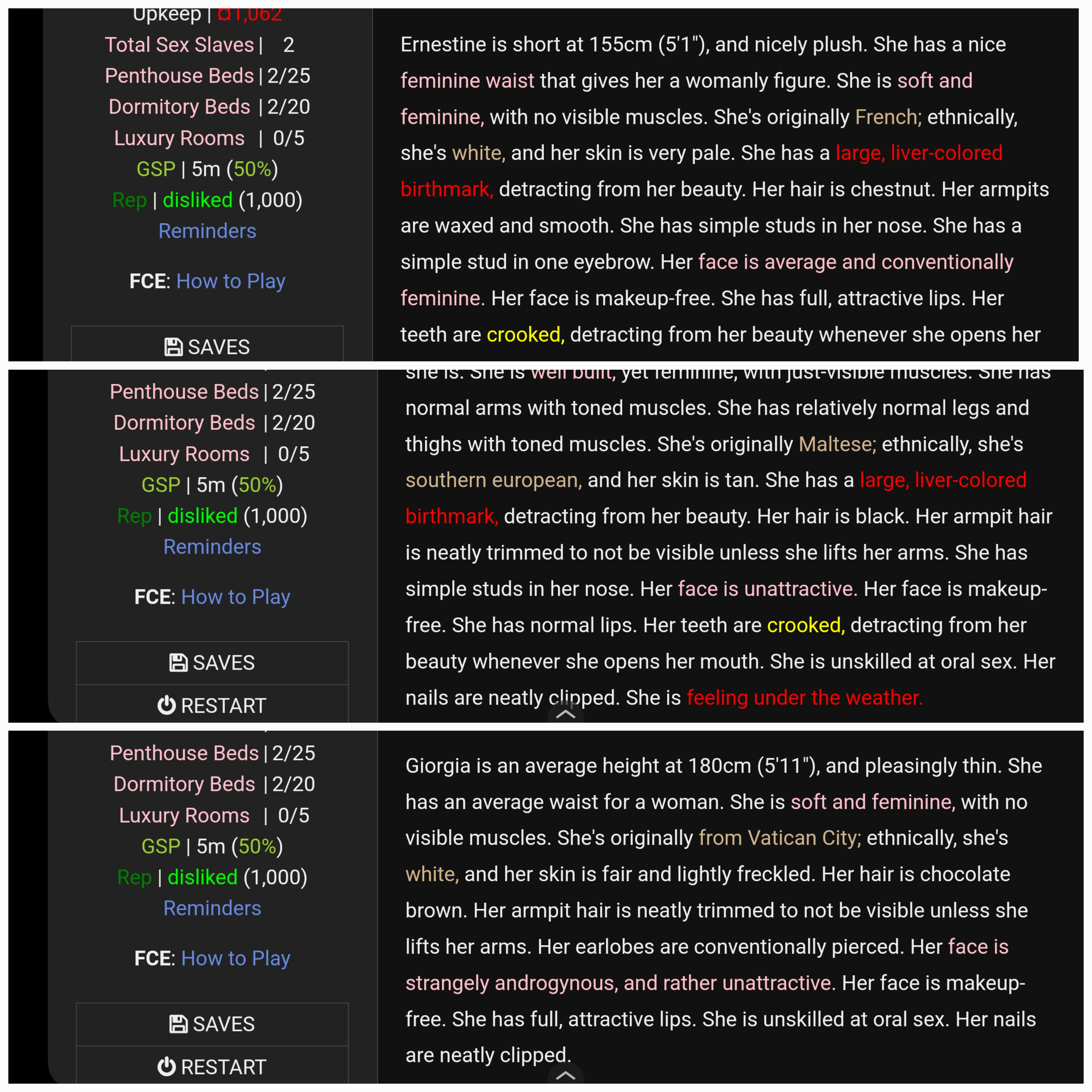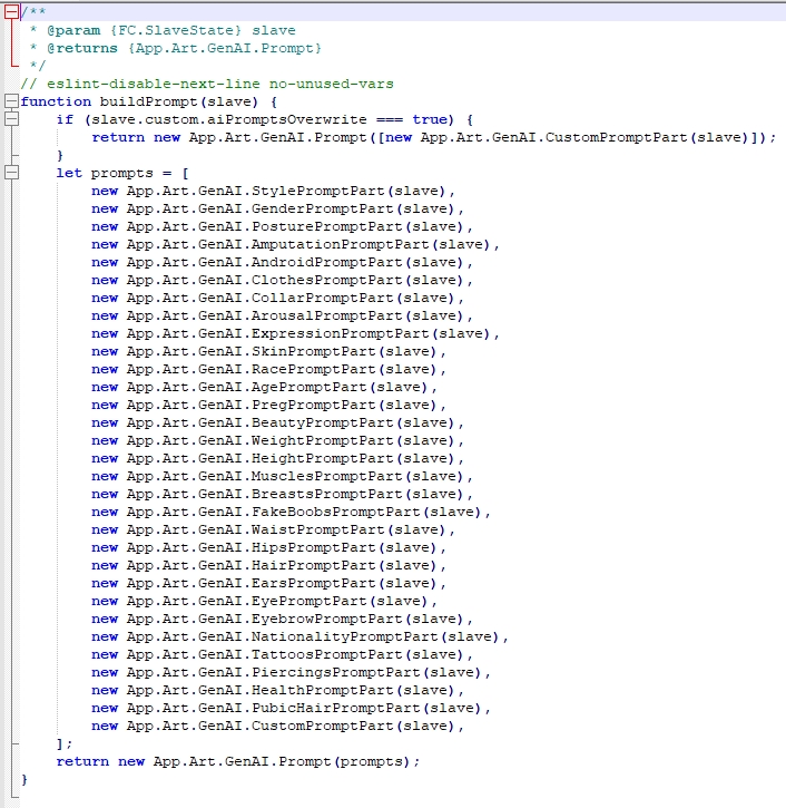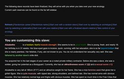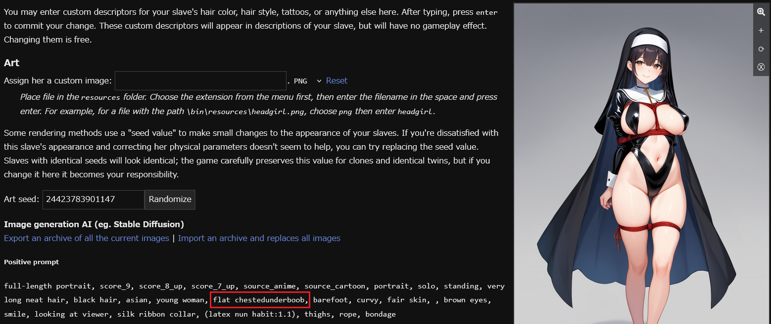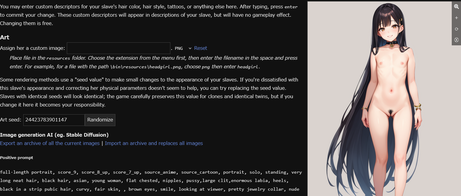 Anyone have a save with a wide variety of slaves I can use to test AI generation with FC prompts? I'm planning to do some tweaks to the automatic generation and I'll probably write a script to handle automatically gen the prompts/send them to StableDiffusion, but if someone has a save I could use to test now that'd be appreciated.