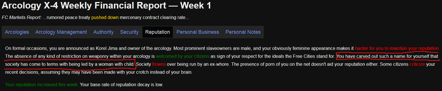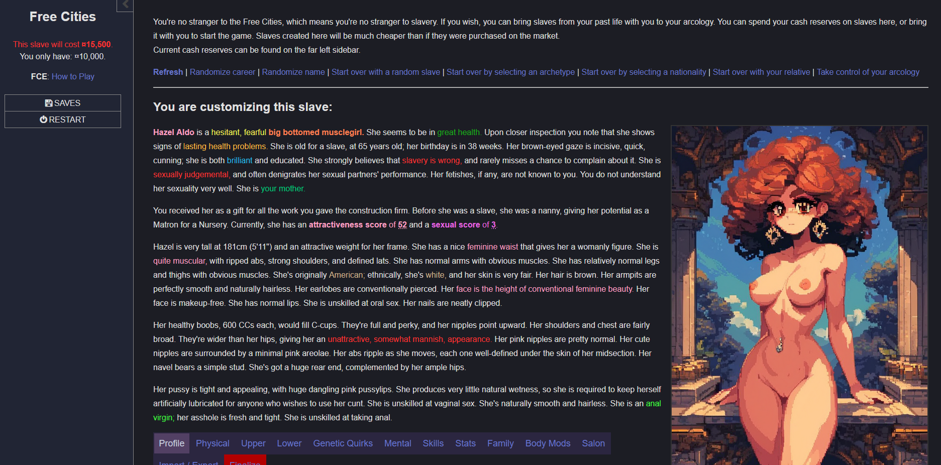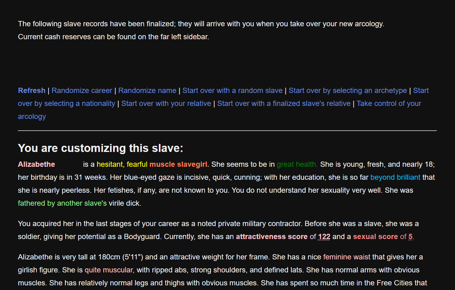 Setting a starting slave's career to "an arcology owner" doesn't seem to give a bonus, at least not during creation. I assume since the game checks the string that it will properly give the bonus after starting, but I don't know if this just isn't supposed to be allowed for the player to start with, or if it's missing from the careers.js file, or if adding it there myself would fuck up the actual game's code.