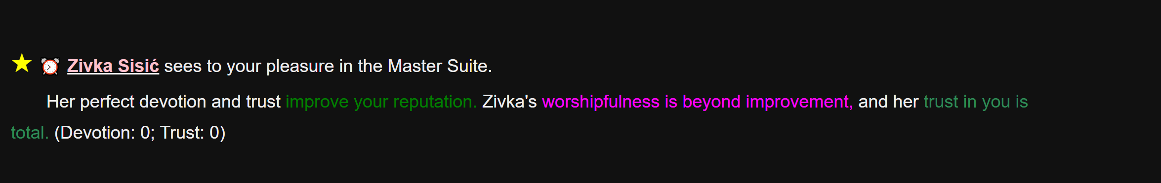 Another feature request. Custom Loras for specific keywords. Like say for gags, I have a lora called "Gagged.safetensors". Would love to be able to use that whenever a slave is using a gag without having to manually go into the slaves stuff and customize the promt for them individually.
