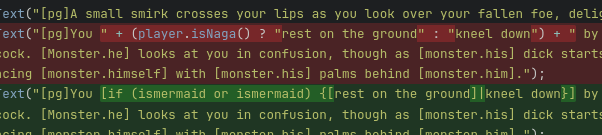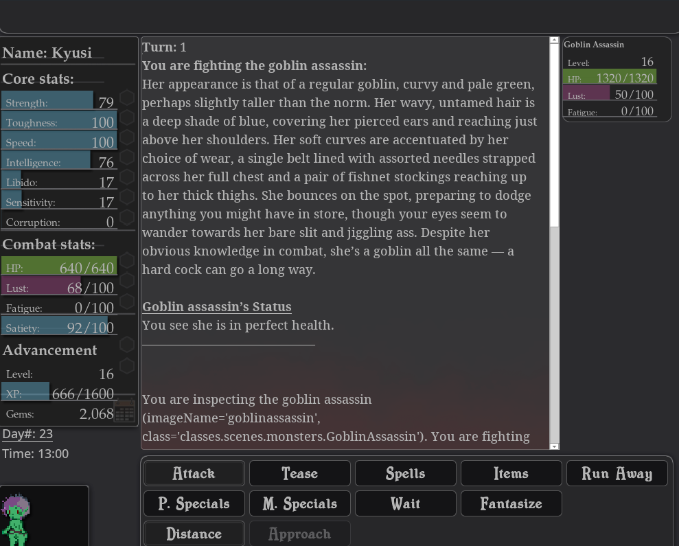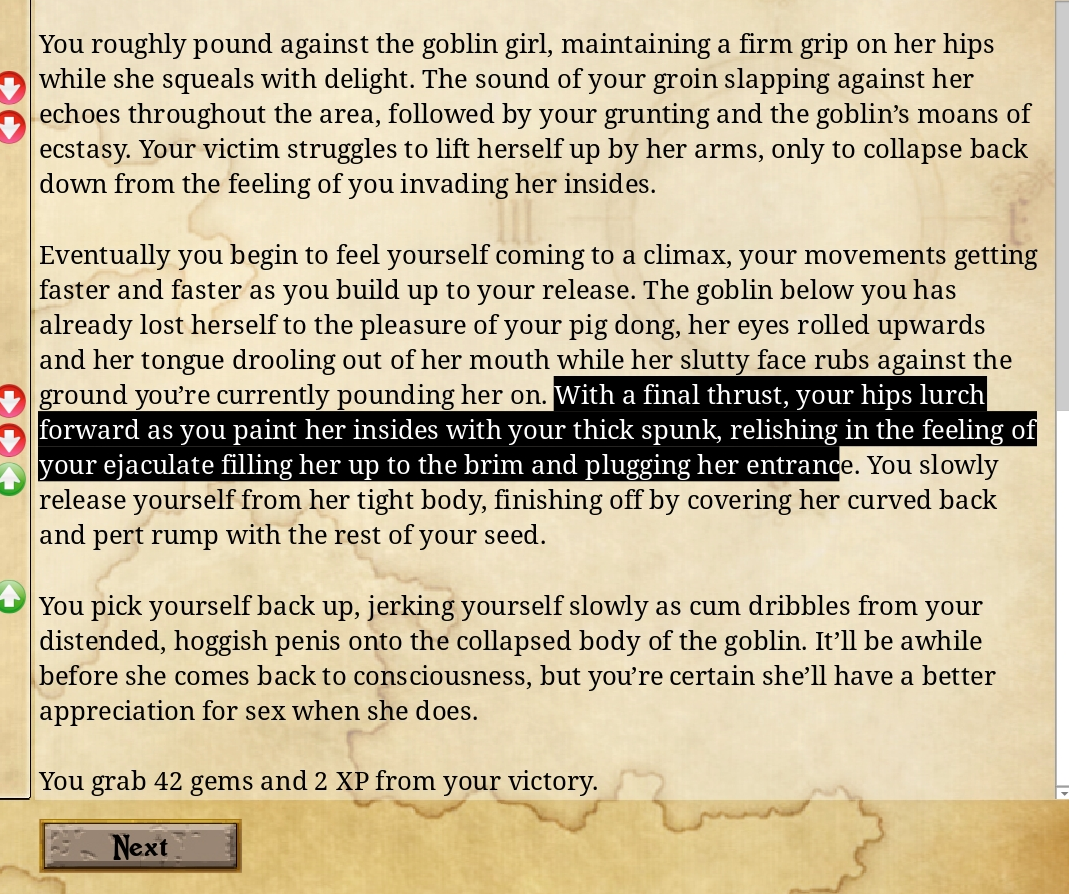 Weird that this choice comes up—oh, it's a question of fuck the battered and bloodied succubus or just finish killing her. I don't think the buttons are good, it'd be clearer to say "Rape" or "Finish" or some such. The tooltip "Enjoy the last of her beauty" doesn't say enough.