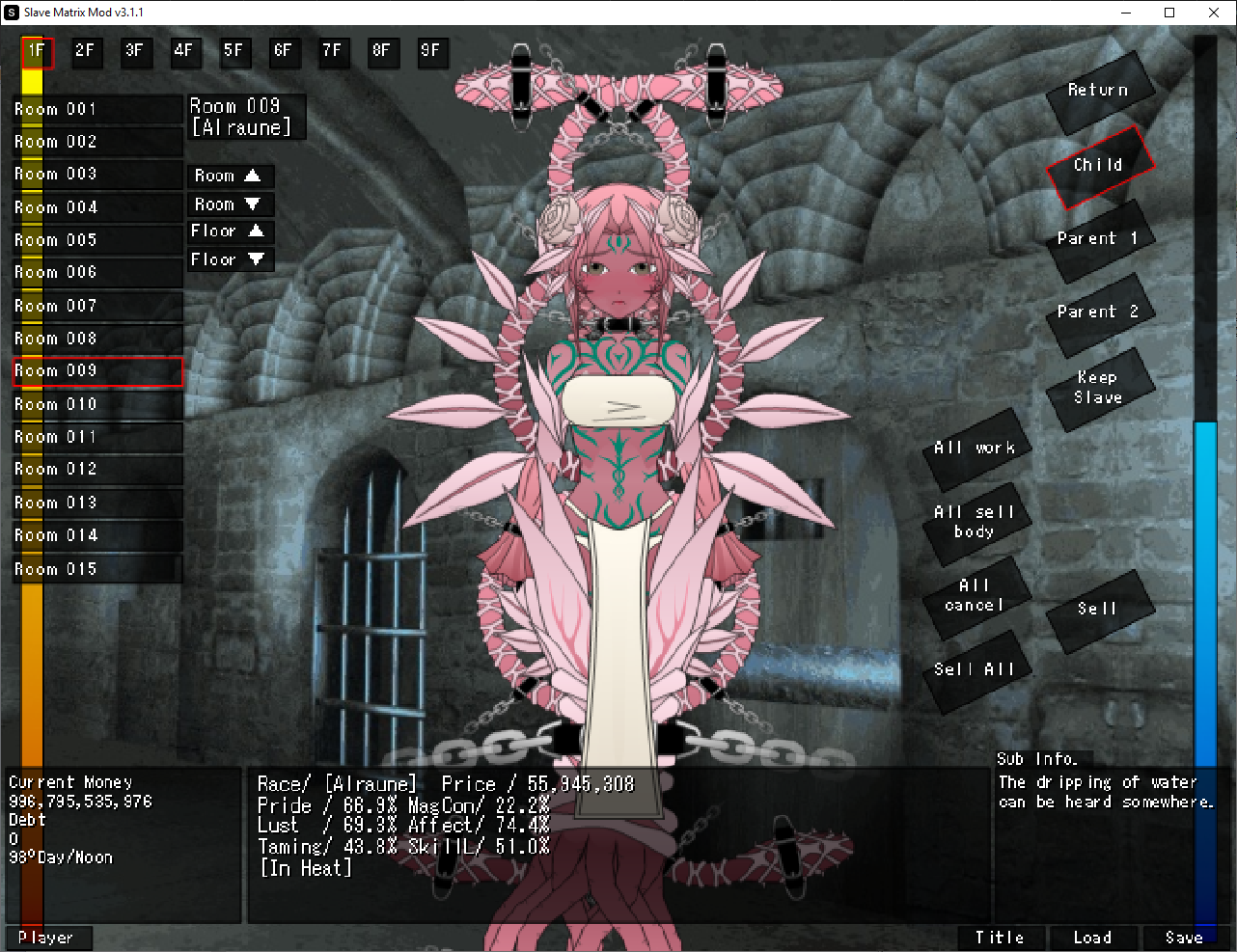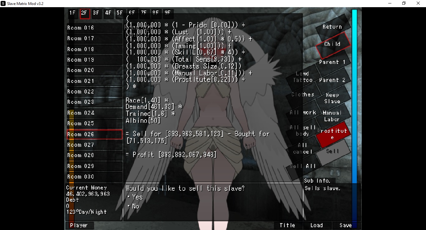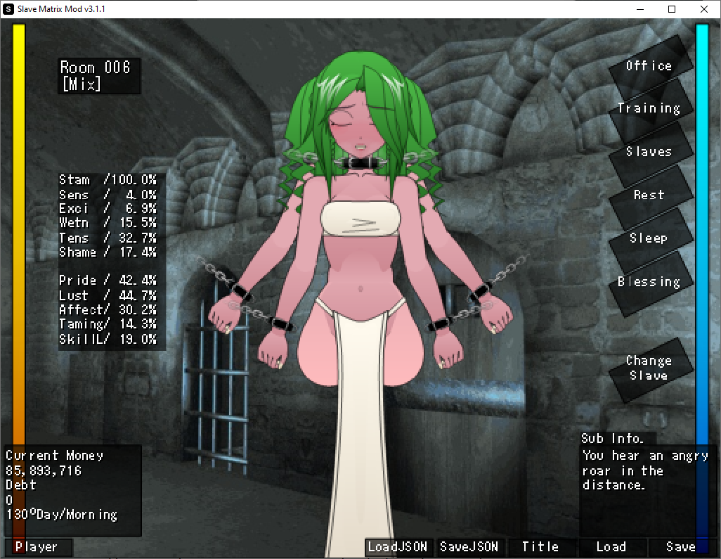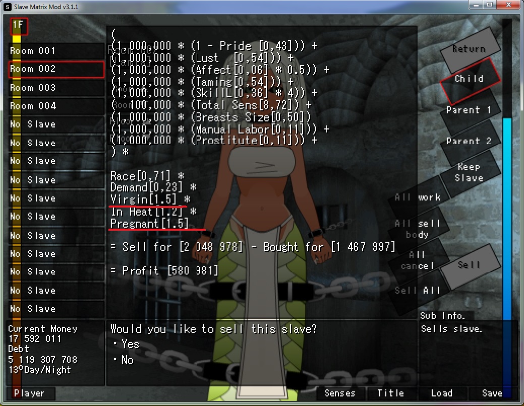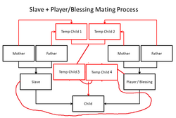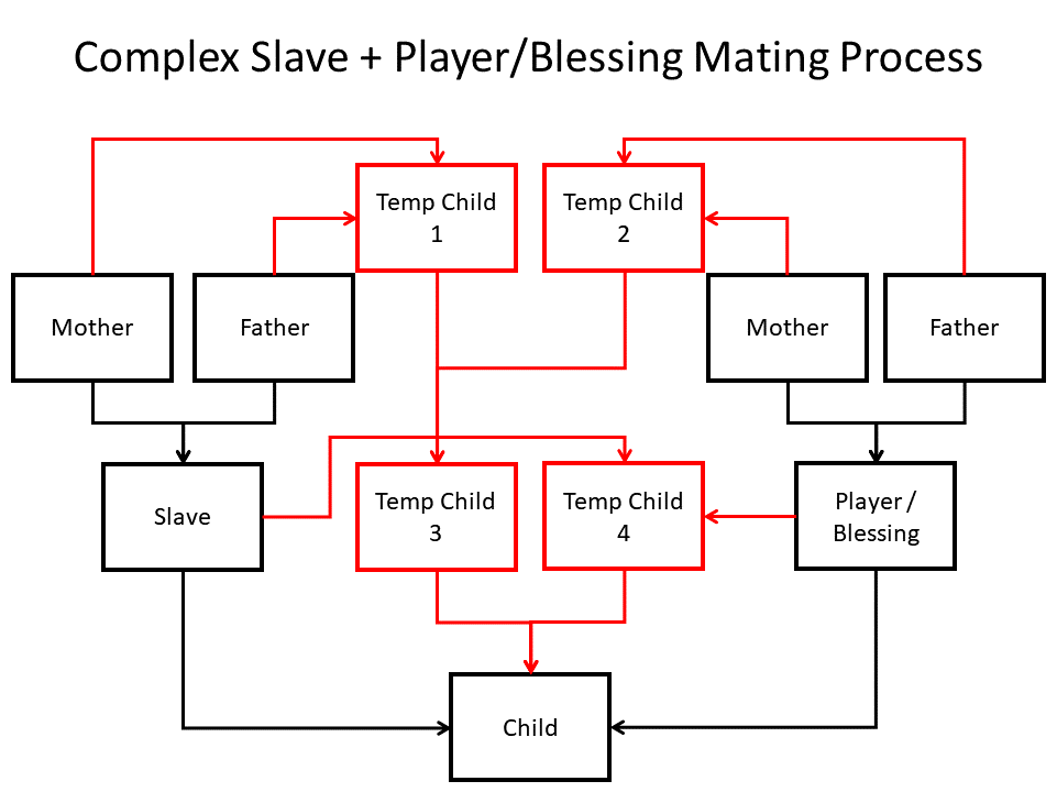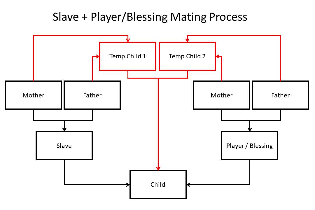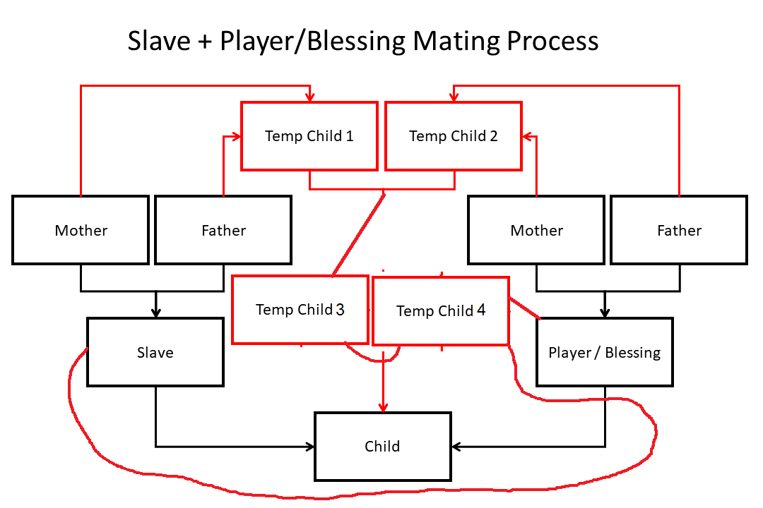 That is the dev's explanation on how it works, I just translated it into English. I know it's not that clear so here's a visual that will hopefully make it easier to understand. Black is what you see happening (and what happens with SimpleMating on), red is what actually happens. It takes the parents of the slave and the player, mates them to make 2 new children, then mates those children together to finally get the real child. So to answer your question, genes go as far back as the parents. Grandparents do not exist, you can check this by looking at a slave's parents in the JSON, their mother and father values will be null.